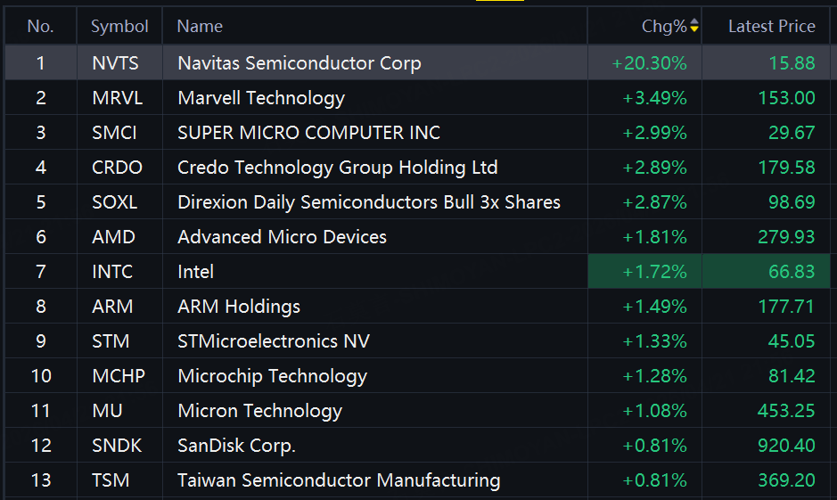 Chip, storage shares jumped on Tuesday. Navitas Semiconductor up 20%; Marvell up over 3%; SMCI, Credo, SOXL up around 3%; AMD, Intel up nearly 2%; ARM, Micron up over 1%.