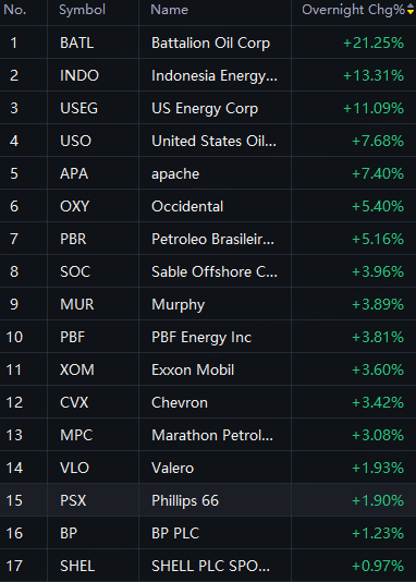 Oil Stocks Jump in Overnight Trading; Battalion Oil up 21%; Indonesia Energy up 13%; USEG up 11%; USO and apache up 7%; Occidental and PBR up 5%.