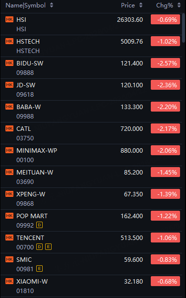 In terms of star stocks, Baidu down 3%; Alibaba, MiniMax down 2%; Pop Mart, Tencent, XPeng, Meituan down 1%.