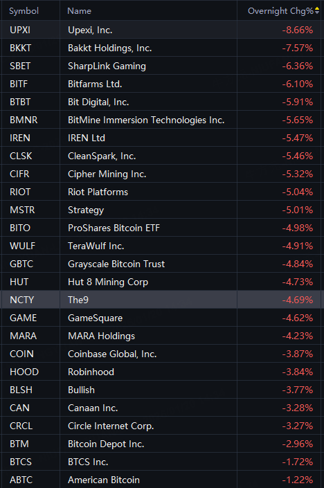 Upexi down 9%; SBET, BTBT, Bitfarms, BMNR down 6%; IREN, Strategy, GameSquare down 5%; Coinbase down 4%.