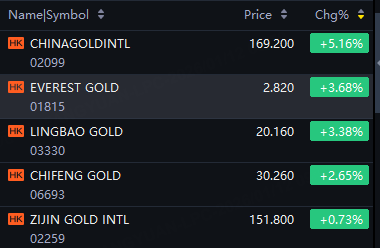 China Gold Intl up 5%; Everest Gold up 4%; Lingbao Gold, Chifeng Gold up 3%; Zijin Gold Intl up 1%.