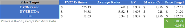 Amazon's share price is down over 35% YTD, leading to many investors believing the stock is at a bargain. By multiplying consensus analyst estimates for FY22 by the average multiples for EV/Revenue, EV/EBITDA, and P/S of Amazon and its competitors, a fair value of $148.79 can be calculated after adjusting for the company's cash and debt. This gives the stock an implied upside of about 40.08%. As for analysts, the average 12-month price target currently sits at$178.56, giving an implied upside of 68.21%.