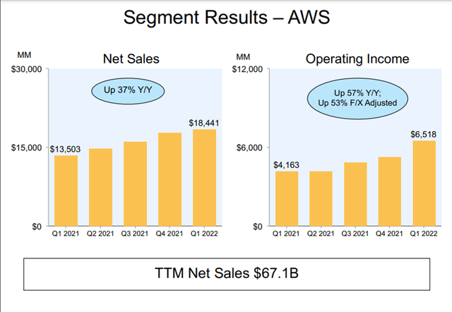 AWS is seen by investors as one of the key bright spots of Amazon's upcoming future. AWS is currently the largest cloud services provider with a 33% market share while only accounting for 14% of Amazon's total revenue. This likely means that AWS has room to grow for Amazon's total sales, as well as in the industry. In the company's most recent earnings report, AWS thrived while retail struggled. The segment grew by 36.5% Y/Y and beat analyst projections for revenue and operating income. The segment's operating margin also increased from 29.8% to 35.3%. All of this has allowed AWS to generate $67.1 billion in sales in the past 12 months and continue to rise as cloud services see more demand.