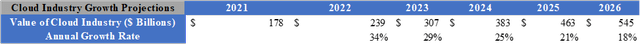 The reason behindAWS'smassive growth is due to the rising demand for cloud services and exponential growth of the industry. Over the past few years, the cloud industry has consistently grown at about34% per year. With this growth rate, we can project how large the cloud services industry may be in upcoming years. By starting with the industry's current size of about$178 billion and a 34% growth rate that wanes by 15% each year, the cloud industry could be worth about $545 billion in 2026.