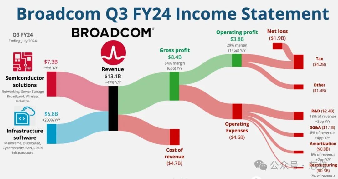 AI产品线的收入增长了四倍,凸显出市场对Broadcom AI芯片的巨大需求。同时,2023年11月完成的VMware收购也为2024年的收入增长注入了强劲动力,特别是在基础设施软件领域。尽管半导体解决方案的收入增速相对较慢,但仍保持稳定增长,为公司的整体业绩提供了有力支撑。