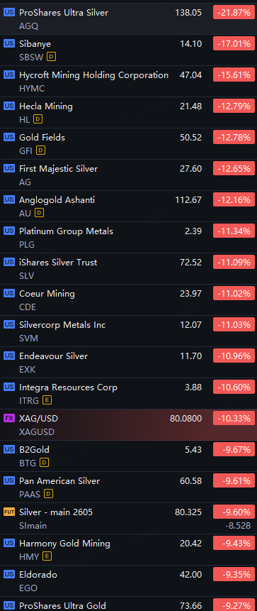 Precious Metals Shares Slumped. AGQ Down 22%; Sibanye Down 17%; Hycroft Down 16%; Hecla Mining, Gold Fields, AG and AU Down 12%.