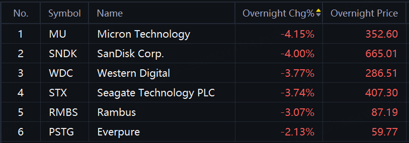 Storage shares slid in overnight trading. Micron, SanDisk down over 4%; Western Digital, Seagate Tech, Rambus down over 3%.