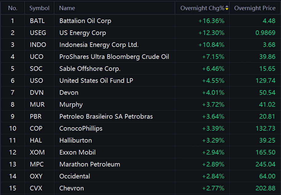 Oil stocks and ETFs jumped in overnight trading. Battalion Oil up over 16%; US Energy up over 12%; Indonesia Energy up 11%; UCO, Devon up over 4%.