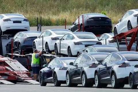 特斯拉加州弗里蒙特工厂生产的电动汽车装车