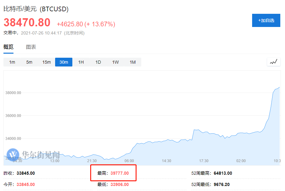 北京时间7月26日早间,比特币加速上涨,两小时涨9%,一度涨至39779美元,逼近40000美元关口,升至6月中旬以来最高水平。