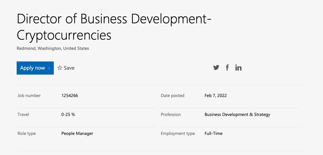 本周一,微软在其招聘网站上发布了一则招聘数字货币开发总监的启事,寻找能帮助公司在数字货币领域,以及最重要的Web 3.0领域开疆扩土的专业人士。