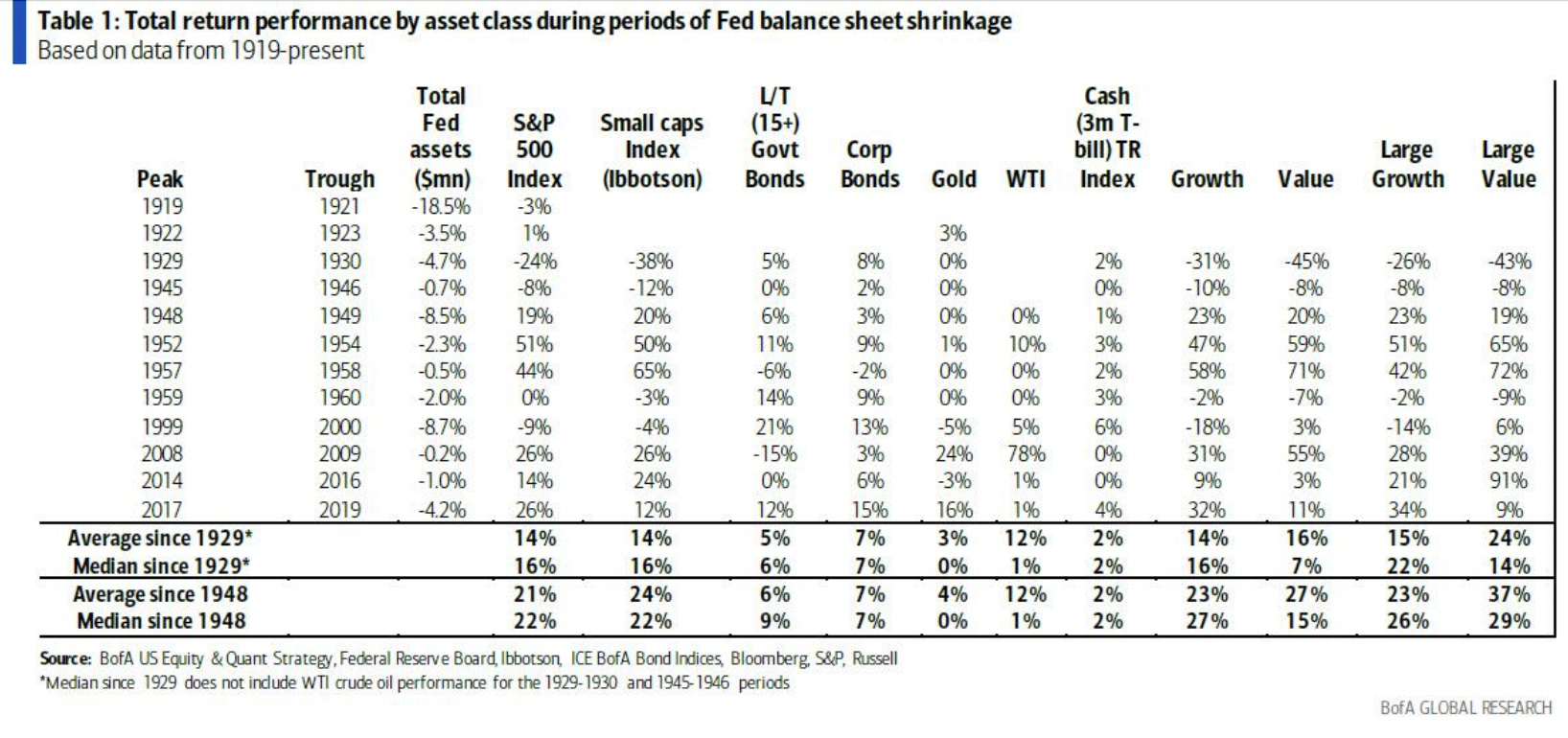 此外,在资产负债表缩减期间,历史表明股票>债券,价值股>成长股,大盘股=小盘股。