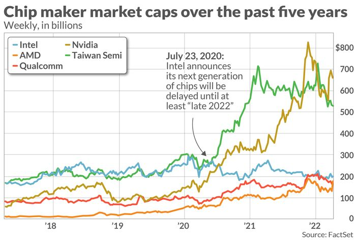 Since then, a host of changes have occurred in how people interact with technology, and other companies have specialized in taking advantage of those changes, causing Intel to fall behind. While the company was worth as much as rivals Advanced Micro Devices Inc. and Nvidia Corp. combined five years ago, Nvidia is now worth as much as the other two combined, a massive sea change in semiconductor valuations that mirrors the change in the industry itself.