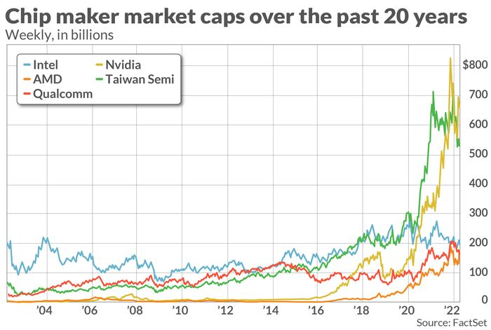 Five years ago, Intel was worth as much as Nvidia and AMD combined; now, Nvidia is worth as much as the other two as Taiwan Semi also surges, reflecting a massive change in the semiconductor industry in the past decade