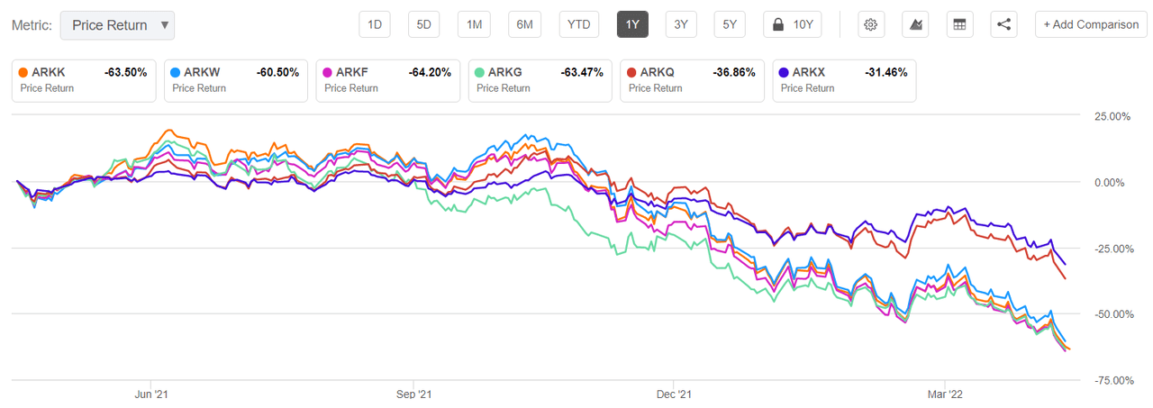 Year-to-date price action on all six of ARK’s actively managed Pacer Swan SOS Fund of Funds ETF|ETFs: (NYSEARCA:ARKK) -58.2%, (NYSEARCA:ARKW) -56.5%, (ARKF) -58.5%, (BATS:ARKG) -51.7%, (BATS:ARKQ) -35.6%, and (ARKX) -27.2%.