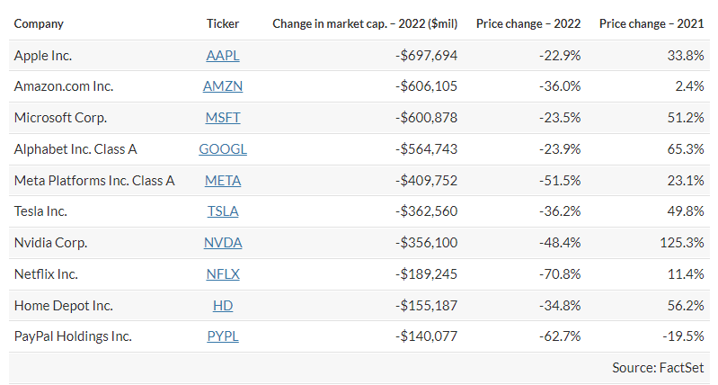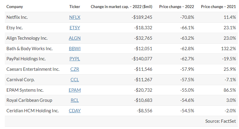 First, here are the 10 companies whose market capitalizations have dropped the most during 2022, based on early trading on June 30. (This column will be updated after the close of trading.)