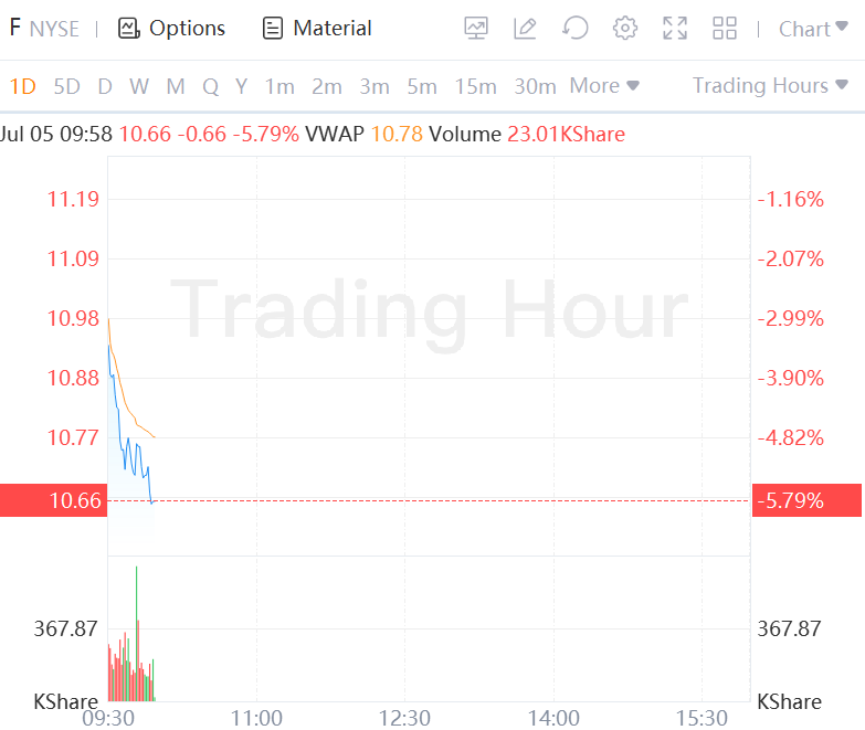 Shares of Ford Motor Co. $(F)$ dropped 5.79% toward a 17-month low in morning trading Tuesday, even after the automaker reported a year-over-year jump in U.S. vehicles sales for June despite ongoing industry semiconductor and supply constraints.