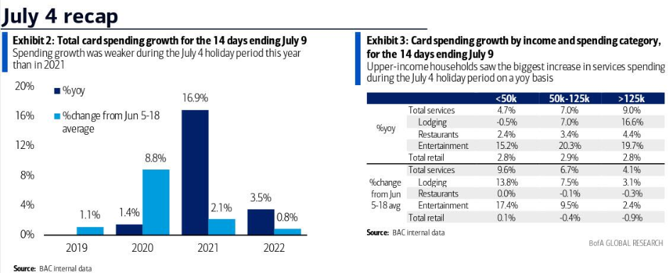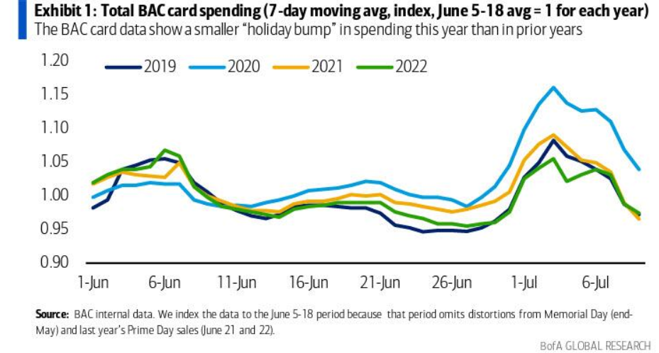 此外,美国银行经济学家Aditya Bhave此前对7月初独立日假日消费数据进行了分析,按照BAC汇总的信用卡和借记卡衡量,在截至7月9日的两周内,支出只有一个小幅的"节日冲击",同比增长3.5%。