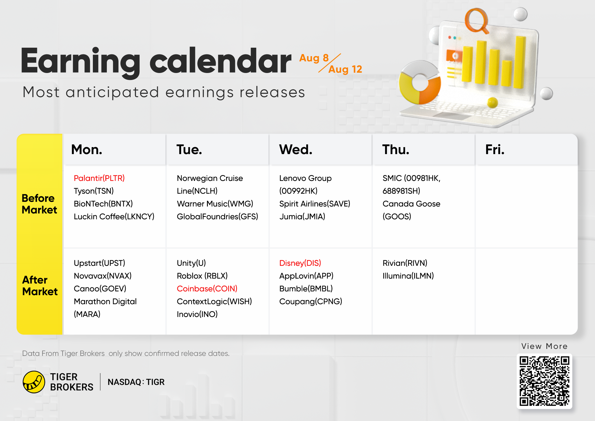 On Monday, Palantir, Tyson Foods, BioNTech, AIG, and Take-Two Interactive Software will report. Coinbase Global, Norwegian Cruise Line Holdings, Sysco, and Ralph Lauren go on Tuesday, followed by Walt Disney and Fox Corp on Wednesday. Cardinal Health, Rivian Automotive, and Illumina report on Thursday, then Broadridge Financial Solutions closes the week on Friday.
