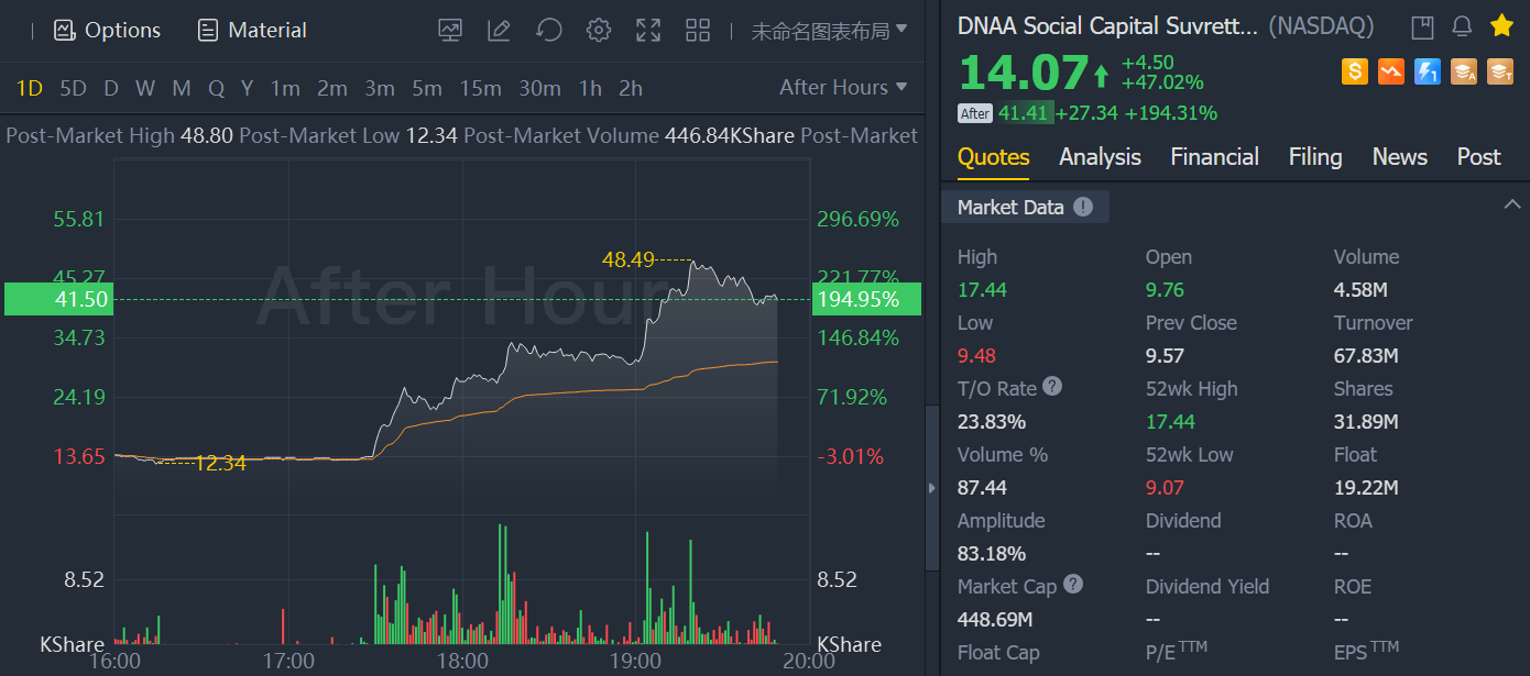 Shares of blank-check company Social Capital Suvretta Holdings Corp. I rose 47% to $14.07 after it completed its combination with digital medicine company Akili Interactive. The stock continued to soar nearly 200% after hours.