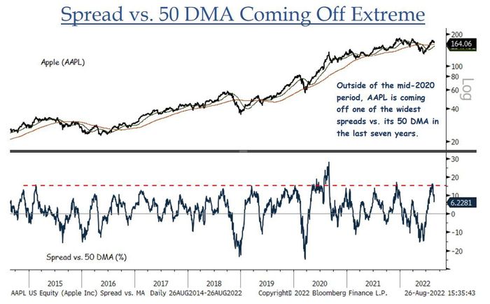 According to Krinsky, Apple shares, which were down more than 2% on Monday, look vulnerable for the following reasons: until last week, Apple shares had exceeded the stock's 50-day moving average by one of the largest margins seen over the past 7 years.