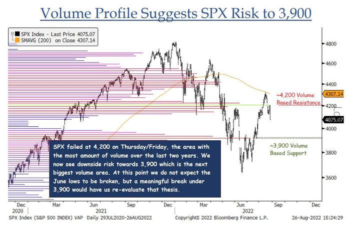 Based on volume-weighted technical indicators, Jonathan Krinsky, chief market technician at BTIG, expects 3,900 will likely serve as the next key support level for stocks. While Krinsky doesn't presently expect stocks to return to their mid-June lows, a sustained break below 3,900 by the S&P 500 might be enough to change his mind.
