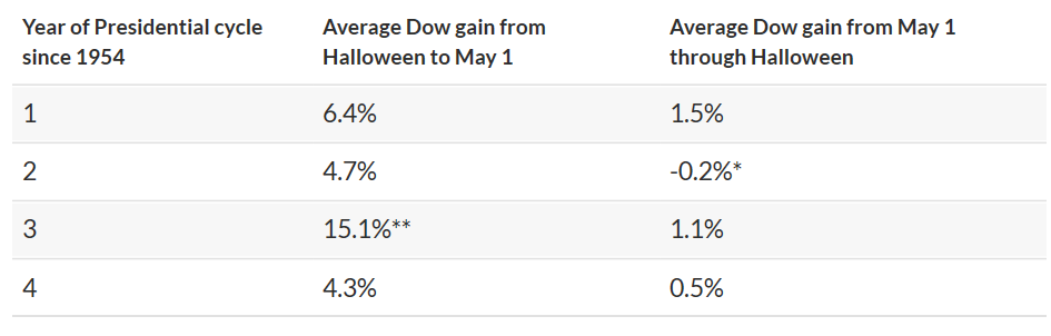 This pre- and post-midterm pattern is so pronounced that it is the source of the famous seasonal pattern known as the "Halloween Indicator," according to which the stock market is strongest between Oct. 31 and May 1 and weakest the other six months of the year. Yet take away the six months before- and after mid-term elections and the Halloween Indicator disappears.