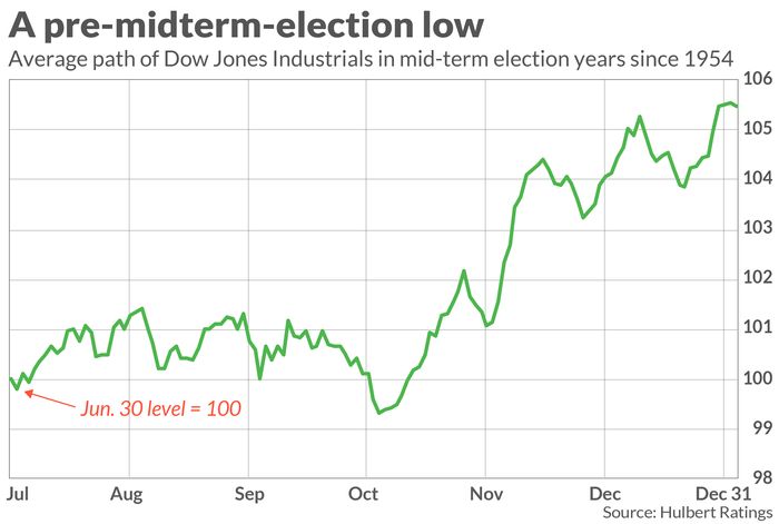 Though the date of the average in this chart is in October, the actual lows in the historical record can come earlier or later. Much depends on when the stock market begins to anticipate the outcome of the midterms and therefore discounts it. A good guess is that the low this year will be later, given the uncertainty about the election outcome -- especially in the U.S. Senate.