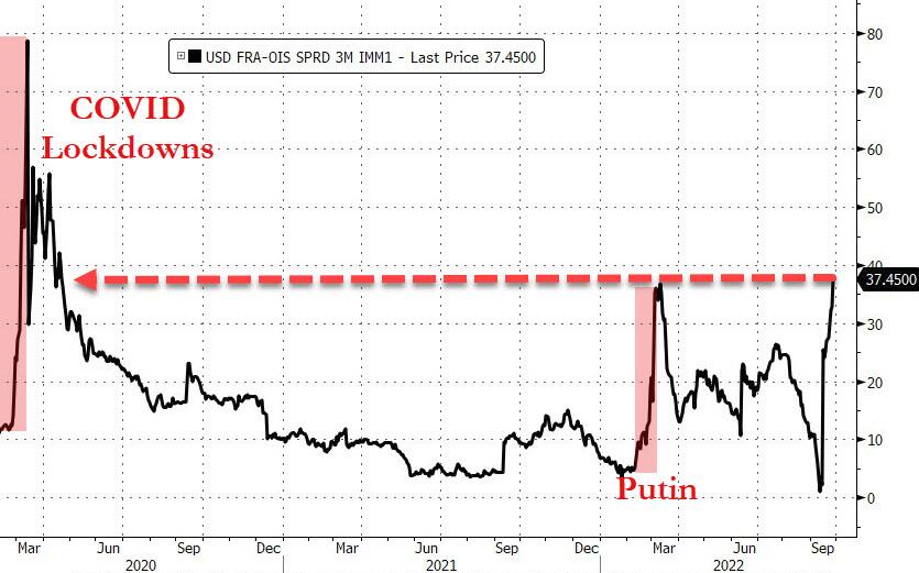 自美联储为2020年疫情引发市场流动性危机而祭出超常规宽松举措以来,市场的压力从未像现在这么大。因此Zerohedge预计,未来几天和几周会听到更多类似美联储救市的消息。如果FRA-OIS利差再升10到15个点,美联储将别无选择,只能安抚市场保证金融系统不会再来一次瘫痪。
