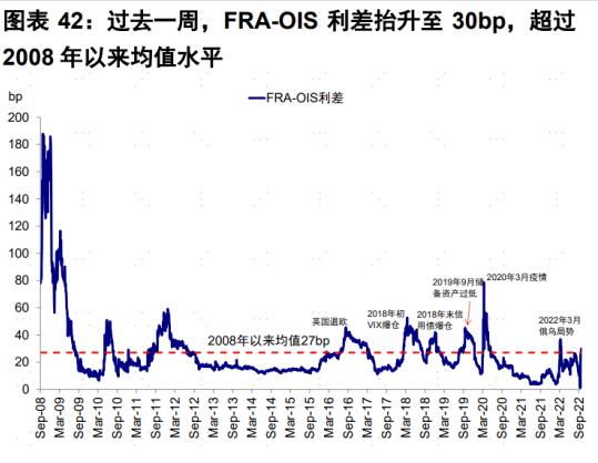FRA-OIS利差最近扩大到37个基点以上,已经超过七个月前的流动性危机时期水平,当时的危机是因今年2月俄乌冲突后西方对俄制裁而造成。中金公司海外研究团队最近的文章也指出,过去一周,FRA-OIS利差抬升至30个基点,超过2008年以来均值水平。中金预计,短期内,全球美元流动性收紧和“便宜钱”减少难以有效缓解,不排除会出现新一轮连锁反应的波动。