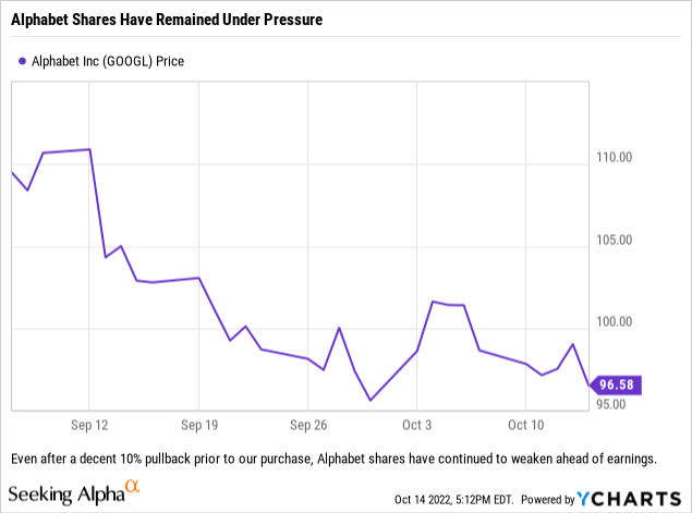 On October 5th we came into the office and extended out past Alphabet's earnings date in order to lock in options premiums as we thought that the shares could pull back further ahead of the announcement - with this being a bear market and all. We chose to sell the November 11, 2022 $108 Calls which generated an options premium of $2.04/share or $204 per contract. Currently we have generated net options premiums of roughly $5.58/share.