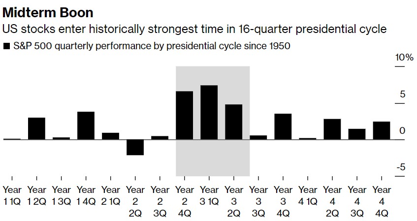 从更长时间来看,美国股市正处于美国总统周期接下来16个季度中最看涨的时期,这让看涨股市的人感到欣慰。Carson Investment Research的数据显示,从历史上看,中期选举年的第四季度和之后的两个季度最为强劲,自1950年以来标普500指数在上述季度的平均涨幅分别为6.6%、7.4%和4.8%。