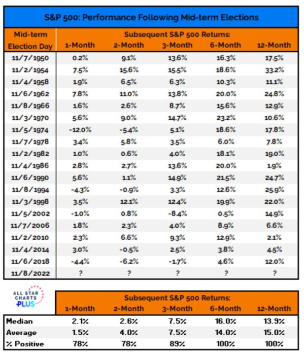 另一个美股强劲的先例是:标普500指数过去几乎没有在中期选举后出现过任何下跌。根据All Star Charts投资策略师Willie Delwiche对1950年以来数据的分析,平均而言,该指数在中期选举后的一个月、三个月、半年和一整年都走高。中期选举一年后,标普500指数平均上涨了15%。