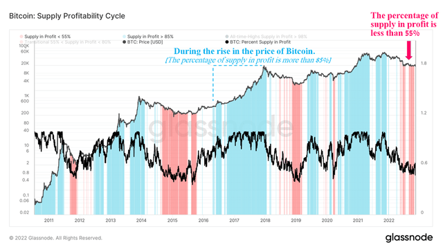 A period of apathy among crypto market participants due to a sharp drop in the profitability of their investments leads to the transition of Bitcoin from more impulsive investors to those who understand the value of cryptocurrencies. These trends can be analyzed using the percent of supply in profit, which provides information about the state of the market cycle. At the moment, this indicator continues to be in a downward trend and thus demonstrates the dominance of the share of supply in losses and, as a result, the preservation of bearish sentiment in the cryptocurrency market.