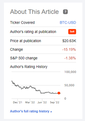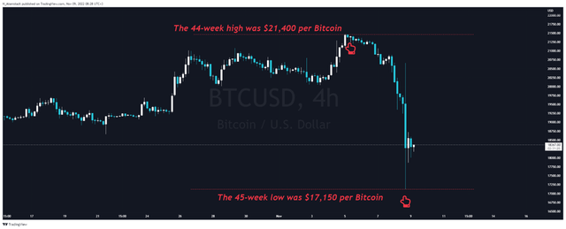 After a period of low cryptocurrency volatility, the price of Bitcoin (BTC-USD) fell sharply from $21,400 to $17,150 and is currently trading in a narrow price range of $18,100-$18,500 after a slight recovery. As described in my previous Bitcoin article, the key reason for the fall below the psychological threshold of $20,000 per Bitcoin is the Fed's fourth consecutive increase in the Fed's interest rate to a record high in the past sixteen years. Investors continue to massively withdraw from risky assets, which only increases the tension in both the stock and cryptocurrency markets, while more conservative participants with significant financial resources seek to wait out the period of macroeconomic instability in assets that bring dividends or coupon payments.