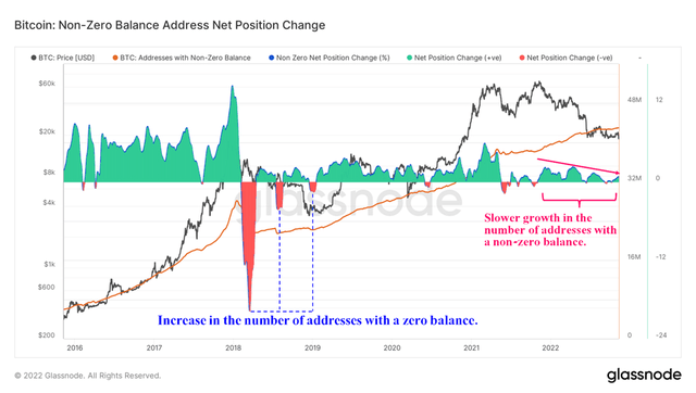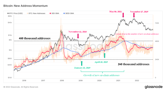One of the most effective tools for tracking and modeling changes in trends in the cryptocurrency market and sentiment among Bitcoin users is the analysis of on-chain activity. The dynamics of new on-chain addresses continue to decline from multi-year highs reached in May 2021, when mass euphoria swept almost all markets and new participants opened wallets and invested in “digital gold”. However, even then, the first signals of a decrease in interest in Bitcoin appeared, as the average monthly rate of new addresses fell below the 365-day simple moving average marked in pink in the chart below. Moreover, a similar situation was observed in February 2018, after which the price of Bitcoin collapsed by 73% in less than a year. At the moment, the momentum of New Addresses is close to another upward spurt, as it happened in November 2018 after a multi-month period of low volatility and marked by a revival of hopes for the start of a new cycle of growth in demand for Bitcoin. However, this was a vain hope, as the price of Bitcoin collapsed from $6,600 to $3,300, and thus finally discouraged the majority of potential investors from buying “digital gold”. Moreover, at times of maximum stress among market participants and the subsequent formation of a bottom, the number of new addresses always reached a value of 240 thousand, which we still have not seen. As a consequence, this once again indicates that the current price range is not a bottom before a new up cycle begins.