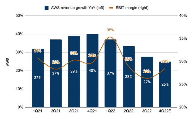 Since Amazon reported Q3 2022 results, consensus AWS revenue and EBIT margin for 4Q22 have been reduced from $23 billion (+29% YoY) and 31% to $22.2 billion (+25% YoY) and 28% (vs. 30% in 4Q21). The current Q4 top-line estimate is consistent with Amazon's comments that AWS growth moderated to ~25% exiting Q3. The 2-point deceleration from Q3's 27% is better than a 5-point deceleration in Azure growth per Microsoft's Q4 guidance. Therefore, I see downside risk to Street estimates and would conservatively model Q4 AWS revenue of $21.7 billion (+22% YoY vs. +25% consensus). This brings 2022E AWS revenue to slightly over $80 billion, up 29% from 2021.