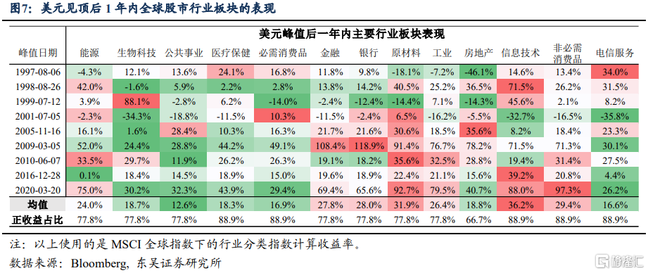 美元见顶之后,哪个板块最受益?从全球股市来看,美元见顶之后收益居前的板块是信息技术、原材料、非必选消费、银行金融和工业股。不过信息技术板块能否继续领跑存在一定的不确定性,其超额收益背后有很大一部分来自于金融危机以来货币政策在面临经济逆风时往往会快速转向宽松,这一幕可能在2023年难以出现,而其他板块在政策转向之外,还有经济边际复苏的重要逻辑。