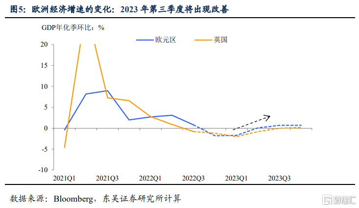 欧元区经济可能在明年第三季度出现比较明显的改善。在经过2022年俄乌冲突、高通胀和货币政策急速收紧的三重冲击后,欧元区经济大概率在2022年底和2023年初进入衰退状态,明年这三大因素的负面影响都会边际减弱、后两者则进一步改善,这会为下半年欧洲经济的复苏创造条件。