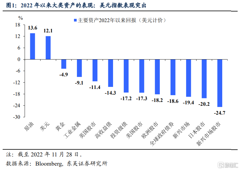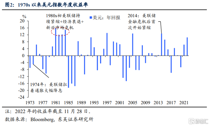 2022年,美元指数再次王者归来,2023年呢?2022年在大类资产中,除了受到严重供给冲击而大幅波动的油气外,美元指数的表现强而且稳——2022年再次成为美元大年(图1)。