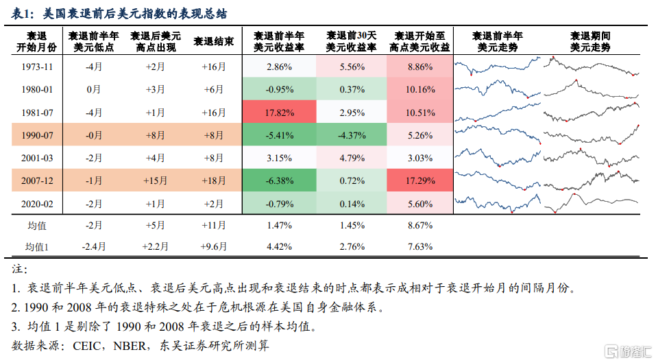 美元如何交易衰退?从1970年以来的衰退经历来看,美元具有较为明显的衰退避险模式,一般而言衰退开始前约2.5个月美元指数触底,而后由于避险情绪升温进入升值模式,衰退开启后2至5个月触顶回落,这取决于美联储转向的速度、力度以及非美经济体的经济韧性(如果主要非美经济体复苏越快,美元回落也越快)(如表1)。