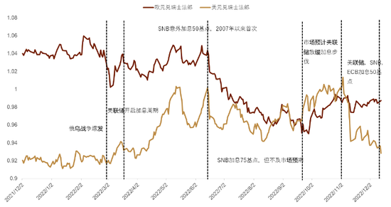 在全年大部分时间受到美联储加息预期支撑进而带动美元整体走强的大背景下,瑞郎兑美元走弱并不意外,但自11月初美联储FOMC会议传递鸽派信息以来,随着美元整体走弱,瑞郎出现明显升值。截至12月16日收盘,瑞士瑞郎对美元小幅走弱2.2%,而对欧元则走强5%,在G10非美货币中排名领先。今年欧元/瑞郎受到俄乌局势恶化带动风险偏好走低影响一度在3月跌至平价附近,此后SNB意外先于ECB开启加息周期使得欧元/瑞郎继续走低。进入10月后,随着欧元的整体反弹,欧元/瑞郎也开始小幅走高至0.99附近。2022年大部分时间内欧元的整体弱势以及瑞士央行意外的提前于ECB开启加息周期可能是瑞郎相对欧元强势的主要原因(图表1)。