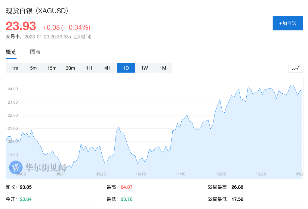 从去年10月开始,现货白银进入了上升通道。1月20日,白银延续升势,至23.93美元/盎司。