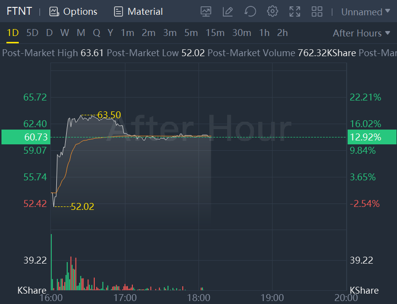 Fortinet (FTNT) shares surged as much as 12.9% after hours, following a 3.4% rise in the regular session to close at $53.78.
