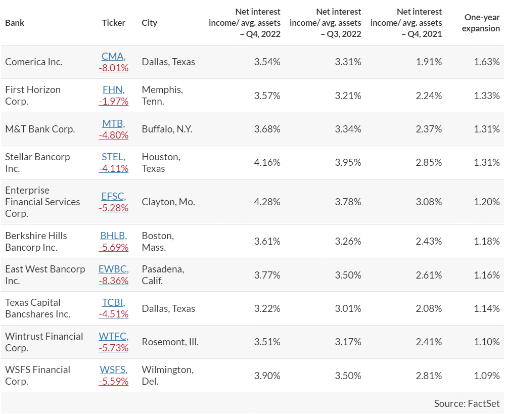 A uniform set of net interest margins for the past five quarters isn't available from FactSet for the full group -- it is only available for 56 of the banks. So instead, we screened for net interest income (total interest income less total interest expense) divided by average total assets.