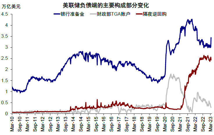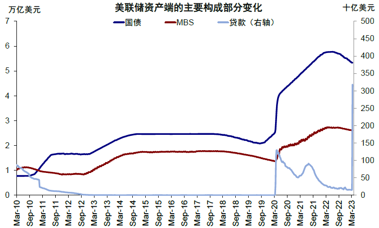 但这个也不能简单且片面的理解为美联储在重新启动QE。近期资产负债表的大幅扩张并非传统意义上的QE式资产购买,而是短期金融机构为应对流动性紧张时的借款(美联储持有国债和MBS仍在继续缩减,表明缩表仍在继续;增加部分主要为贷款,包括一级信贷、其他信用支持及BTFP),二者在购买方式、传导路径和影响方式上都有很大不同。