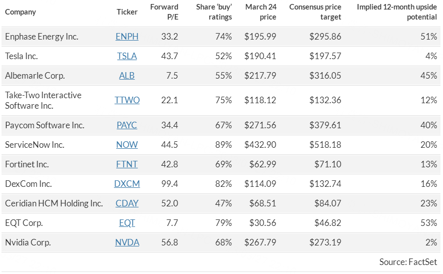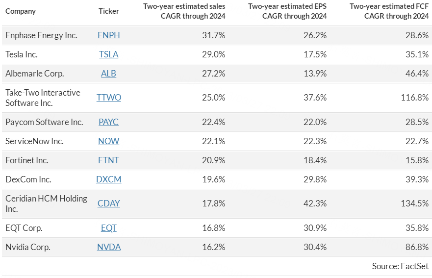 - Then we narrowed further to companies for which the estimates predict compound annual growth rates (CAGR) of at least 15% for sales, 10% for earnings per share (EPS) and 10% for free cash flow per share (FCF) from 2022 through 2024. This brought the list down to 11 companies.