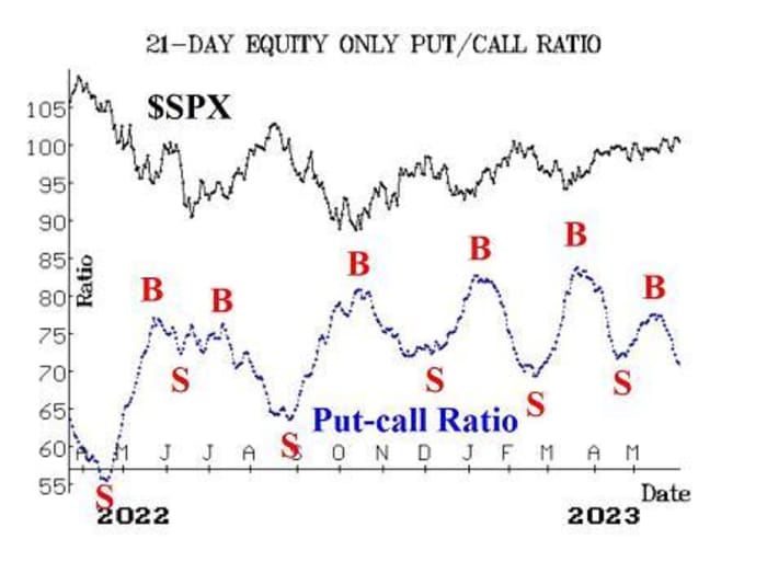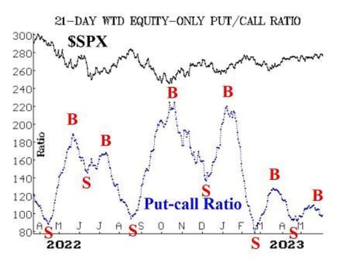 Equity-only put-call ratios have both rolled over to buy signals. The standard ratio’s buy came from a relatively high point on its chart, which is where the better signals usually originate. The weighted ratio, however, never got very elevated before this more recent buy signal took place. Hence, it is coming from a relatively low point on its chart — not often the best of buy signals.