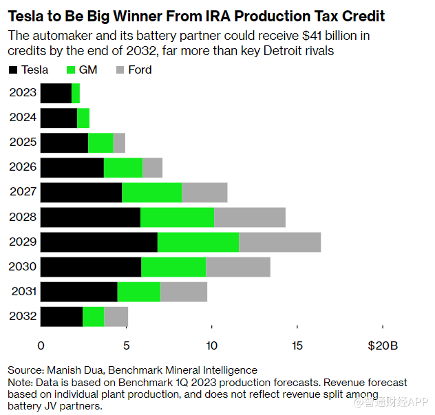 智通财经APP获悉,研究机构Benchmark Mineral Intelligence预测,根据《通胀削减法案》(IRA),特斯拉(TSLA.US)及其电池合作伙伴今年将获得约18亿美元的生产税收抵免,这笔意外之财远远超过通用汽车(GM.US)和LG能源解决方案预计的4.8亿美元。另一家竞争对手福特汽车(F.US)要到 2025 年才能开始从该法案的电池制造税收抵免中获益。