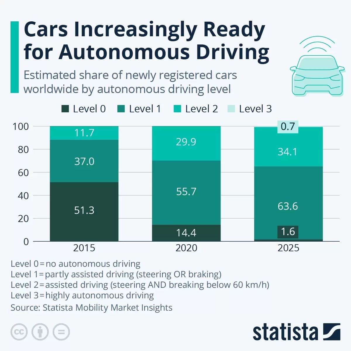 Moreover, level four of automation, which enables fully autonomous driving in passenger cars, is expected to be achieved by 2025, according to the Statista infographic below.